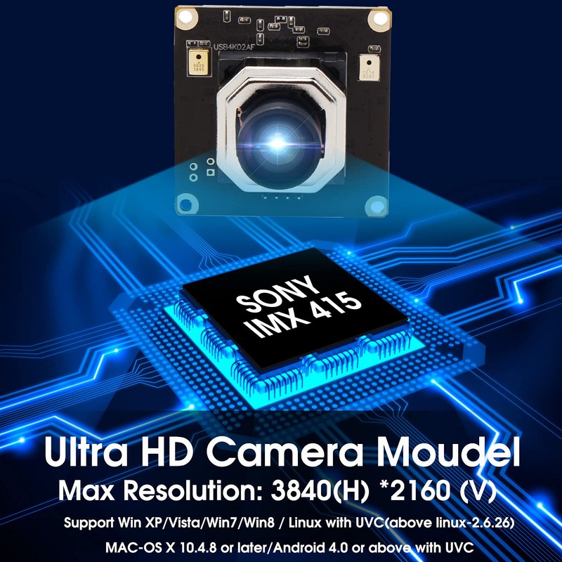 - 4K Ultra HD with CMOS IMX415 image sensor: Ultra high-resolution 4K USB camera module with Sony IMX415 image sensor, delivers crystal clear images 3840 x 2160 resolution with high frame rate 30fps. That's exactly double the horizontal and vertical resolution of 1080p for a total of 4 times as many pixels. This USB camera delivers crisp videos, records professional quality videos in stunning 4K UHD, clearly see all the details and colors that stand out on the screen