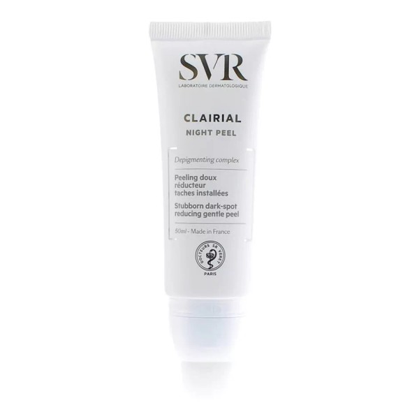 SVR Clairial Nocturno Peel 50 ml Clairial Night Peel es una exfoliación facial que actúa sobre las manchas oscuras, pero en casa. Combinamos la fórmula central de nuestro producto estrella, Clairial Serum, con una enzima de papaya que, gracias a su acción queratolítica en la superficie de la piel, desvanece las manchas oscuras. Desde la primera noche la piel está más clara y luminosa.