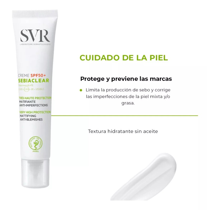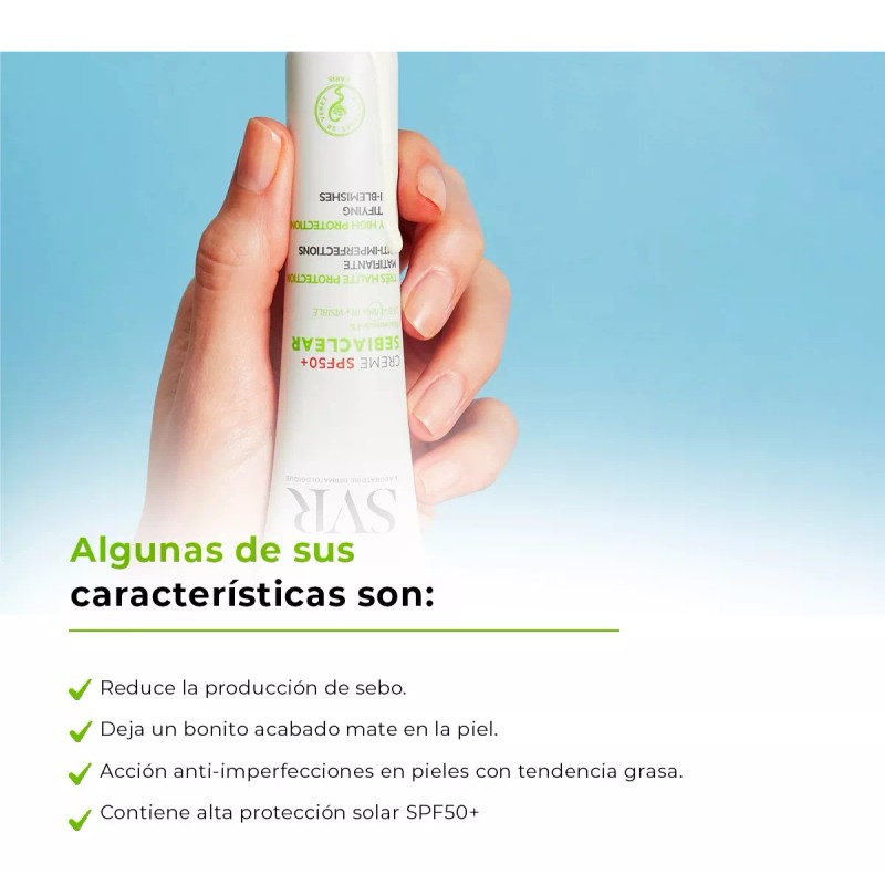 Sebiaclear Crema SPF50+ nueva fórmula, 2 en 1, protección y cuidado solar: reduce las imperfecciones y los puntos negros, matifica y previene las marcas marrones o rojas y el efecto rebote ligado a los rayos UV.