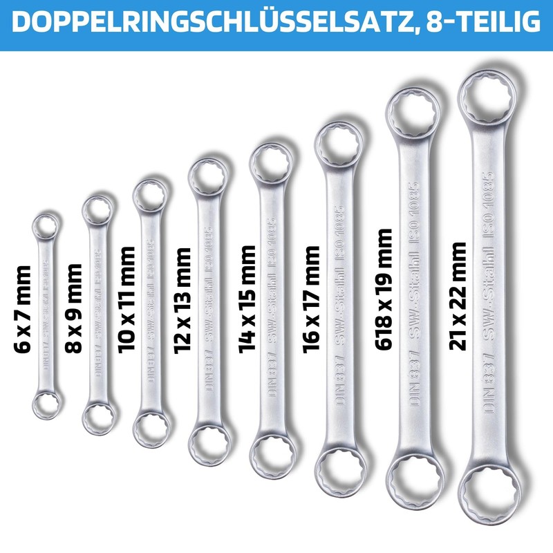 - Box contents: 1x SW-Stahl double ring spanner set of 8. In a practical plastic tube with Euro hanger: ring spanner 6 x 7, ring spanner 8 x 9, ring spanner 10 x 11, ring spanner 12 x 13, ring spanner 14 x 15, ring spanner 16 x 17, ring spanner 18 x 19 and ring spanner 21 x 22 mm. Manufactured according to DIN 837 / ISO 1085.
