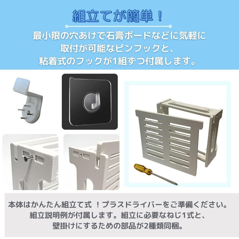 - The main unit is easy to assemble. Prepare a Phillips screwdriver. Example assembly instructions are included. Includes 1 set of screws required for assembly and 2 pieces for wall mounting Includes 2 pairs of self-adhesive hooks for easy mounting to drywall with minimal drilling
