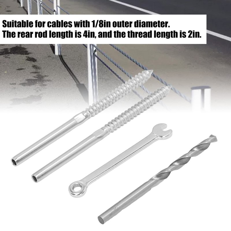 - Railing Screw -- This deck railing hardware fits 1/8" OD cable of the cable deck railing system. The thread lag screws are designed for timber/wood posts. Designed for wooden pole, suits for cables with 1/8in outer diameter, also has 4in rear rod length and 2in thread length.