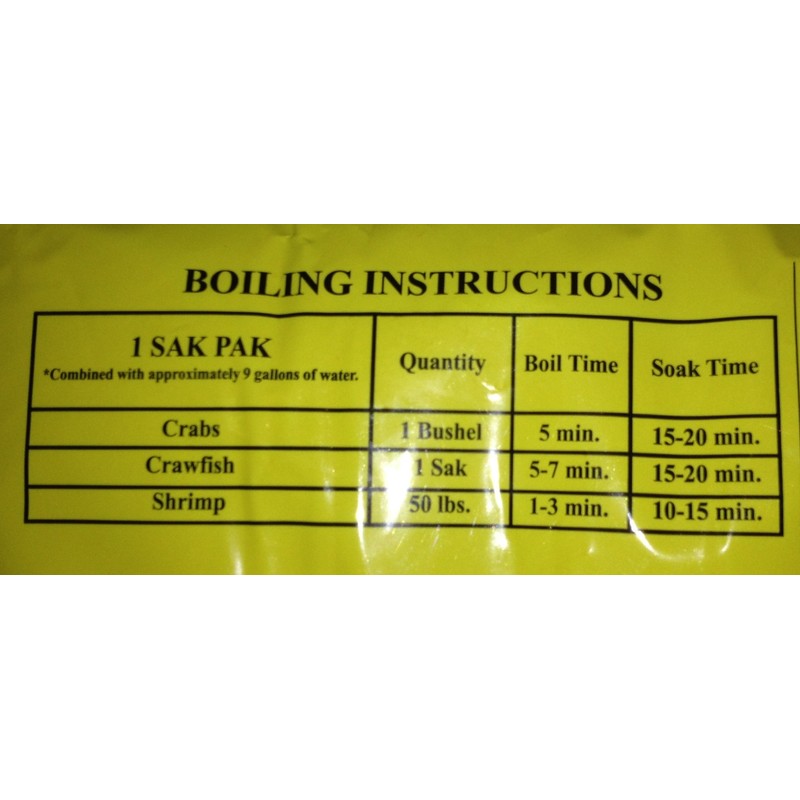 - 1 Sak Pak is good to boil 1 Sak of Crawfish, 50# of Shrimp or 1 Bushel of Crabs.