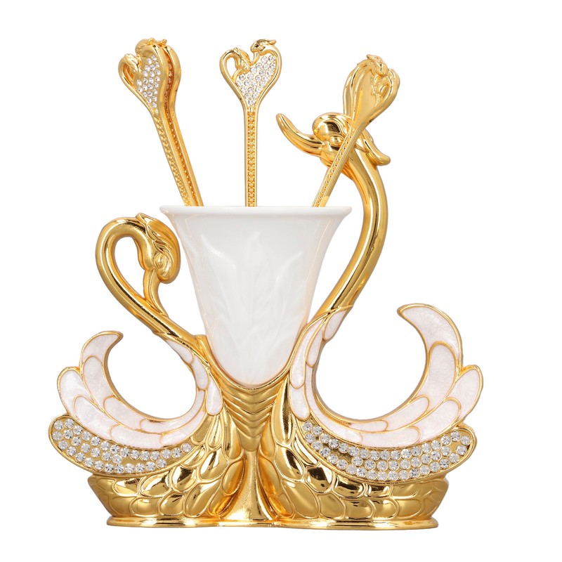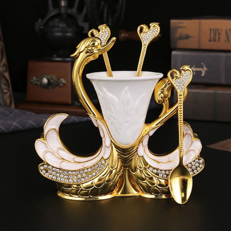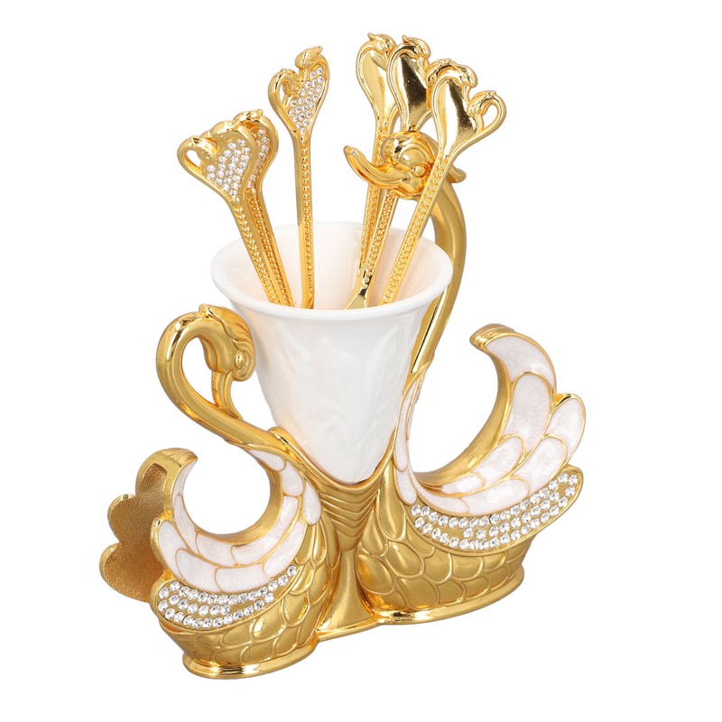 Swan Shape Dinnerware Set Light Luxury Exquisite Elegant Swan Shape Spoon Holder with 6 Spoons for Coffee Fruits Desserts Golden