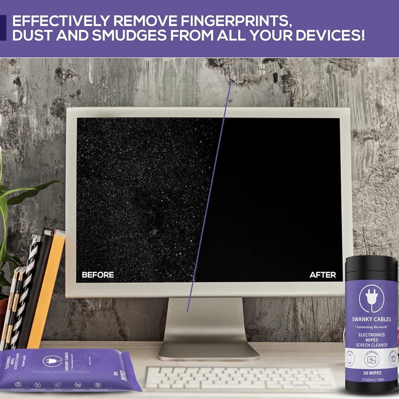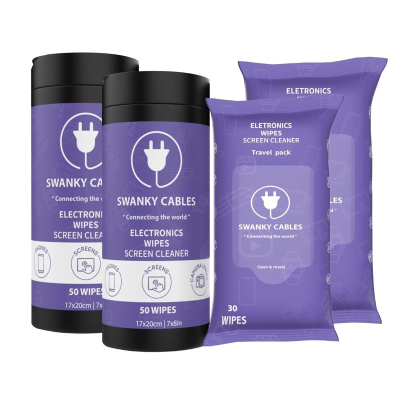 - VERSATILE SCREEN CLEANER - Swanky Cables Screen Cleaner Wipes offer a comprehensive cleaning solution for all your electronic devices. Ideal for TVs, laptops, phones, and monitors, these wipes effortlessly remove dust, smudges, and fingerprints, ensuring your screens are clean and clear.