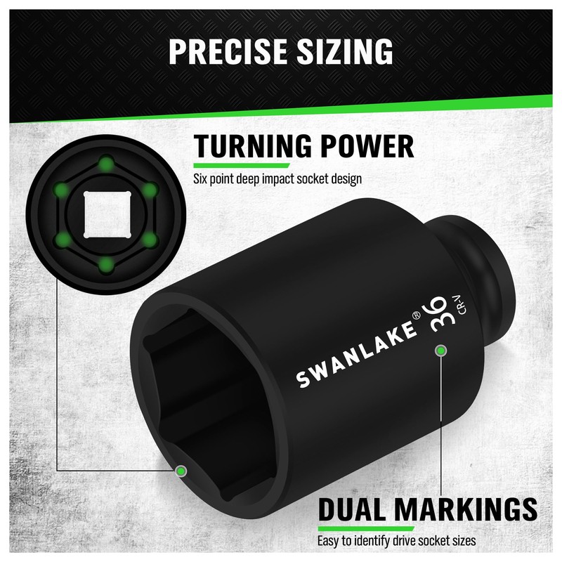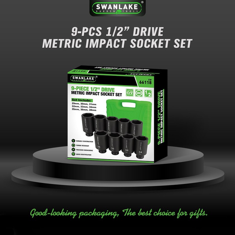 • Contains 9pcs 1/2-Inch deep impact socket,29MM,30MM,31MM,32MM,33MM,34MM,35MM,36MM,38MM,With laser marking
