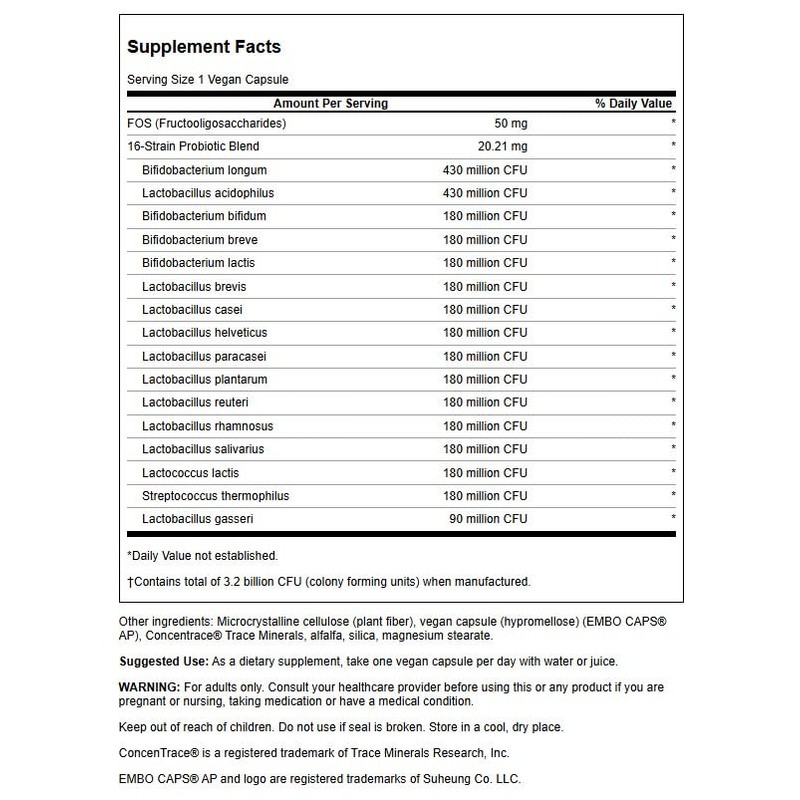 Product descriptionA potent probiotic blend, Dr. Stephen Langer's Ultimate Probiotic with FOS features sixteen strains of probiotics and 3.2 billion CFU per capsule to promote digestive health. That's four times the number of strains and over twice the CFUs in many popular probiotic formulations, and while other probiotic combination supplements contain only two strains of Bifidobacteria, Dr. Langer's formula delivers five. This ultimate 16-strain probiotic formula also contains ten strains of Lactobacillus, including Lactobacillus reuteri, which has a unique affinity for promoting colon health and immune system function, along with prebiotic FOS (Fructooligosaccharides) and ConcenTrace trace minerals. FOS are oligosaccharides that deliver a prebiotic effect. Trace minerals are a vital part of the enzymatic process necessary for healthy digestion and are lacking in the diets of many people.Manufacturer Contact InformationCustomer Service Phone: 1-866-893-1746