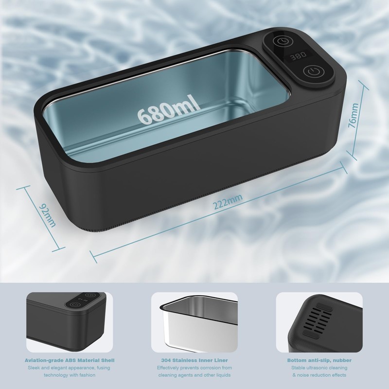 - Portable & Compact Size: The jewelry cleaner machine is lightweight, does not take up space, measures only: 222 *92 *76mm (8.74"L *3.62"W *2.99"H), weighs 0.79kg (1.74lb), and has a capacity of 680ML, making it easy to carry around