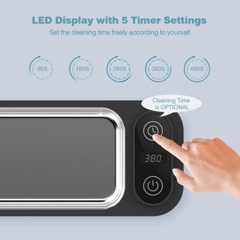 - 5 Time Modes & Touch Button Operation: This ultrasonic Retainer cleaner offers 5 different time modes, you can freely choose the appropriate cleaning time according to the degree of dirt of the items with the TIME button: 90s, 180s, 280s, 380s and 480s. Then touch the Power button to start work. One Touch button with indicator, easy operation