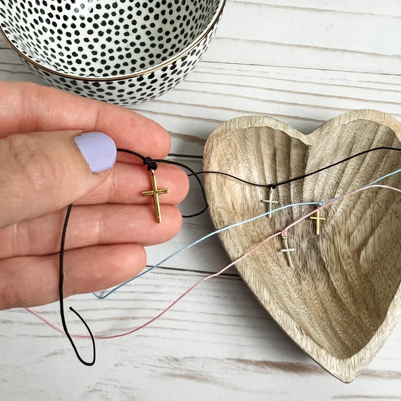 • Multiple string colors available with either silver or gold cross charms