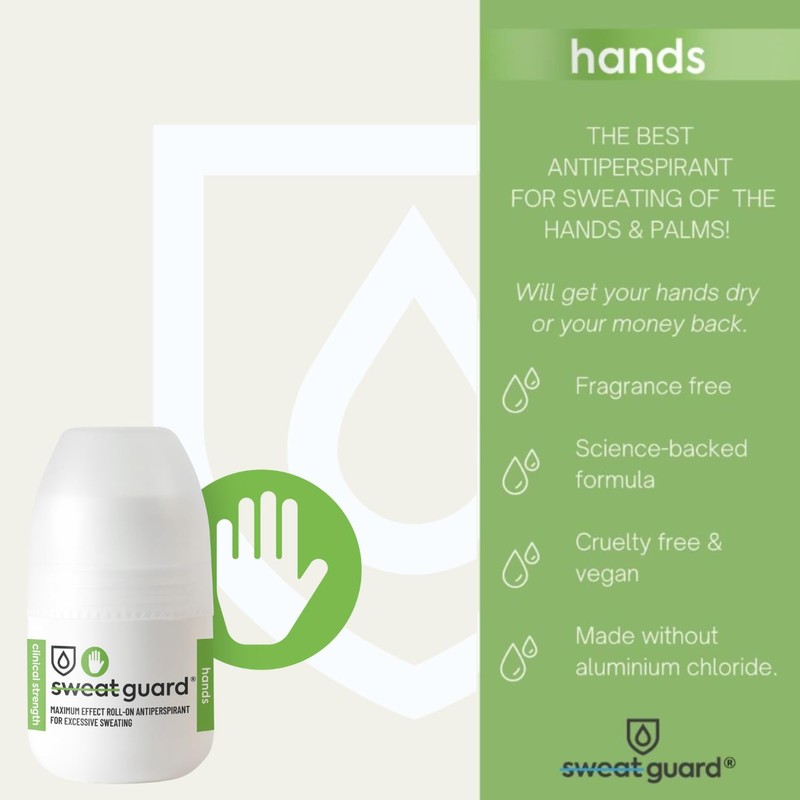 - HAND ANTIPERSPIRANT: Experience freedom from excessive hand sweating with SWEAT GUARD Hands Antiperspirant. Our specially formulated solution provides effective and long-lasting protection against unwanted moisture. Say goodbye to clammy hands and hello to confident, dry hands all day long!