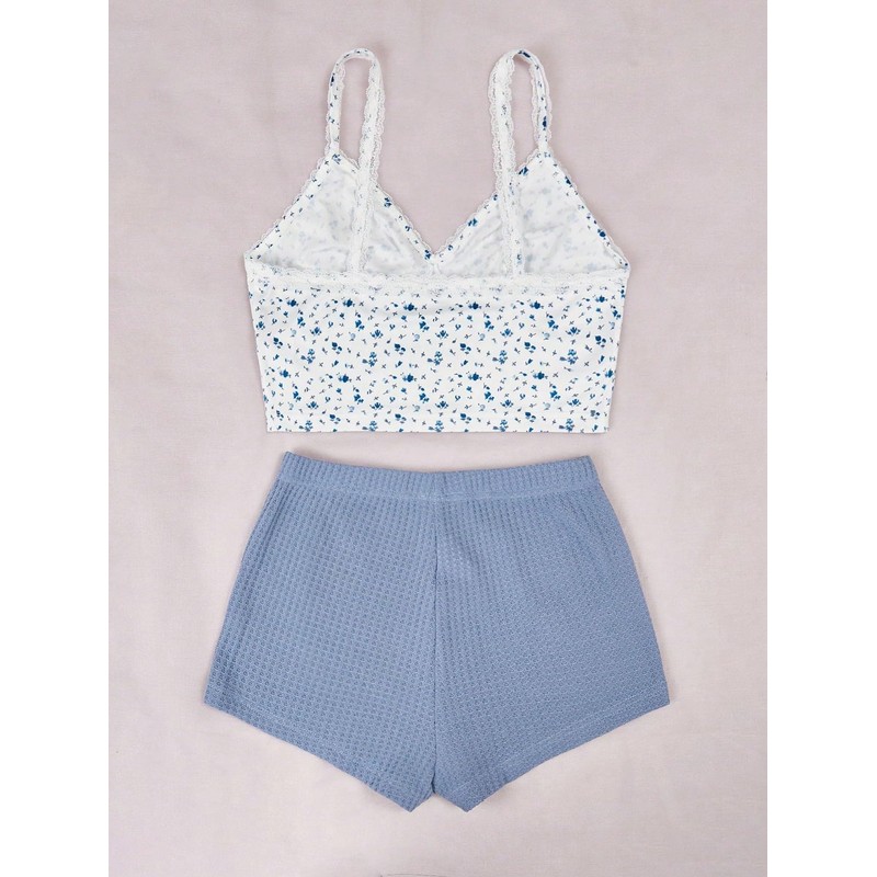 - Features: Shorts, cami, spaghetti strap, pajama set, ditsy floral, lace trim, drawstring pajams shorts, pj set, loungewear, sleepwear
