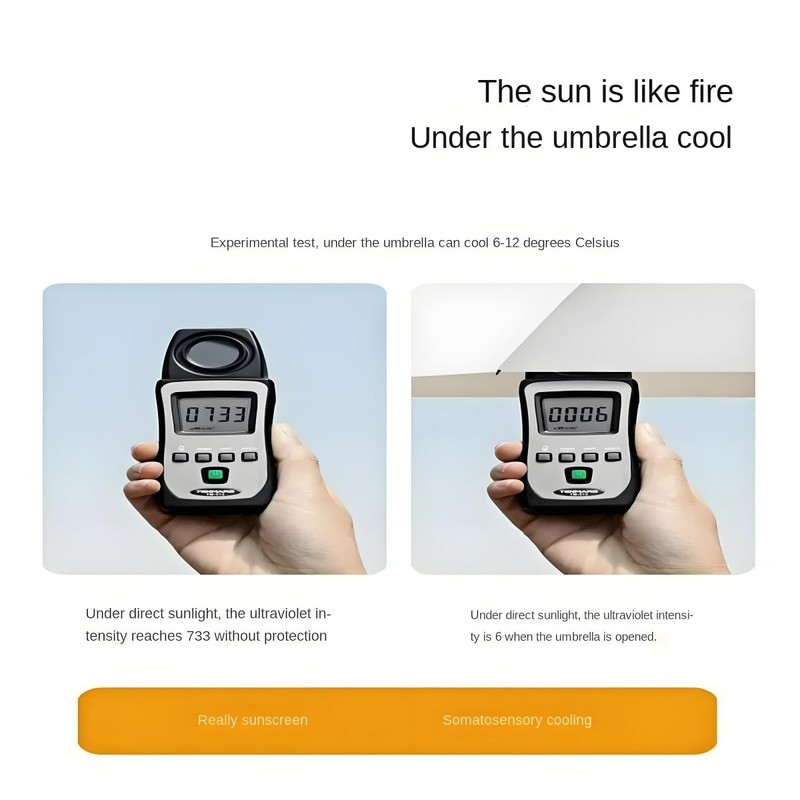 - UPF50+Sunny Umbrella: Made of silver coated fabric that reflects heat, lightweight, compact, three-layer umbrella fabric that is opaque, has a high refractive index, and provides strong coverage to effectively protect the skin from sunburn. It also has an effective 99% UV blocking rate, providing insulation and cooling for a cool and comfortable experience.