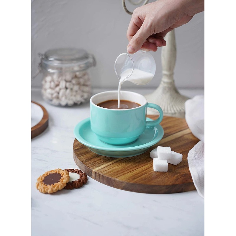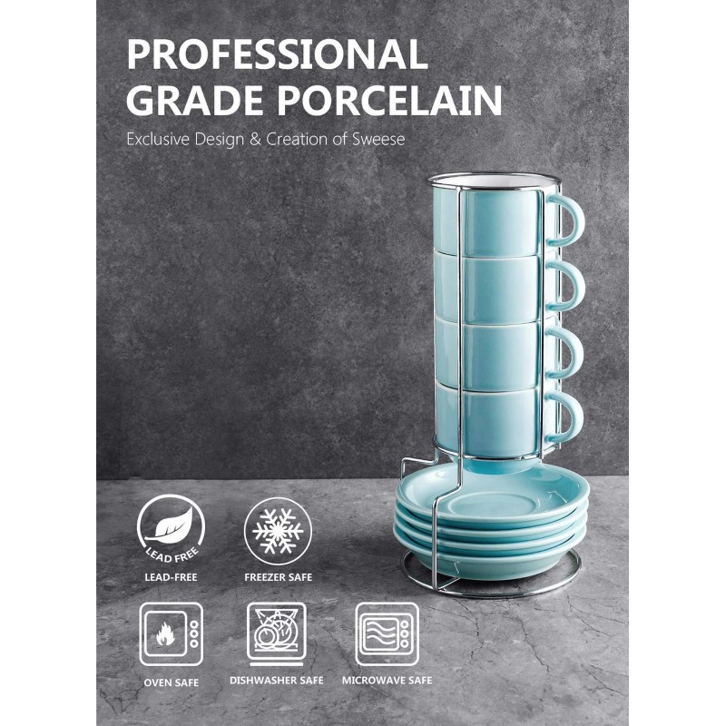Sweese 8 Ounce Porcelain Stackable Cappuccino Cups with Saucers and Metal Stand - for Specialty Coffee Drinks, Cappuccino, Latte, Americano and Tea - Set of 4, Turquoise
