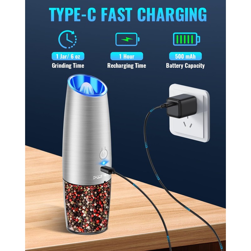 - 【USB Rechargeable】Upgraded electric pepper grinder with built-in rechargeable battery. Fast charging-full charge in one hour and can grind at least 100 grams of spice on a full charge. No need to spend extra money on batteries like other battery operated salt and pepper grinders.
