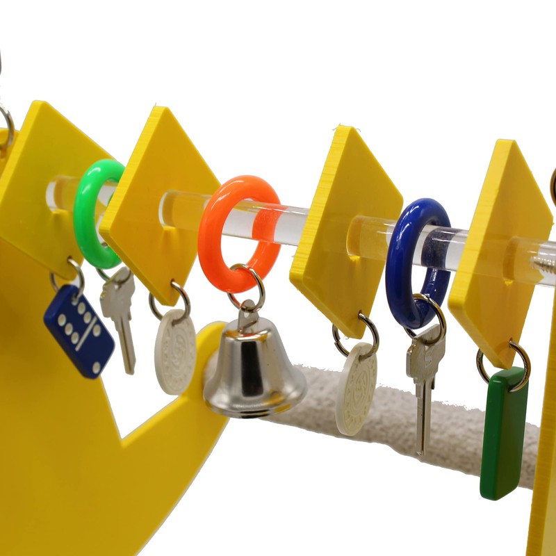 - EXTREMELY DURABLE: Constructed of beak resistant plastic sides with textured and contoured pedicure perches bolted to the sides. Brightly colored hanging toys entice bird to peck and play while rocking.