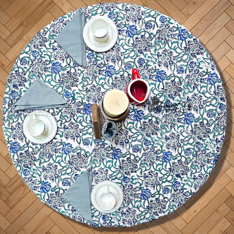- Elevate Your Kitchen And Dining Experience With This Exquisitely Handcrafted Tablecloth And One Gray Napkin Experience The Beauty Of A Hand-Block Printed Floral Design In Shades Of Ocean Blue, And Mystic Teal On A Light Base. Our 100% Cotton Tablecloth Includes One Gray Napkin.