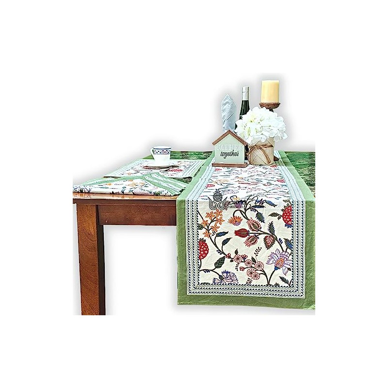 - Elevate Your Kitchen And Dining Experience With This Exquisitely Handcrafted Table Runner And One Sweet Us Gray Napkin . Experience The Beauty Of An Artistic Floral Design Sprinkled With Tastefully Hand-Crafted Vibrant & Eclectic Floral Vines, Petals, & Berries On An Off White Base. These 100% Cotton Placemats Include One Sweet Us Gray Napkin.