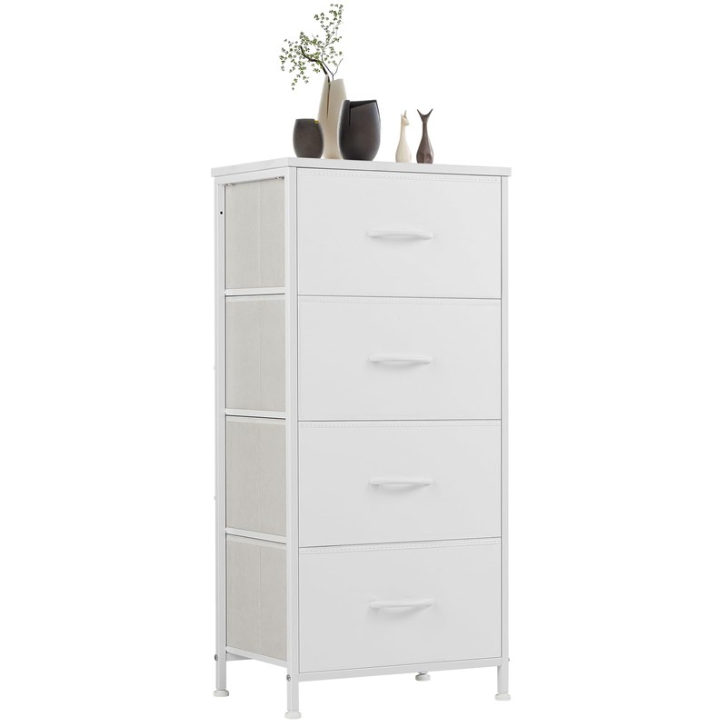 Sweetcrispy Dresser for Bedroom, Storage Drawers, Skinny Fabric Storage Tower with 4 Drawers, Tower Organizer Unit, Chest of Drawers with Wooden Top for Closet,Entryway,White