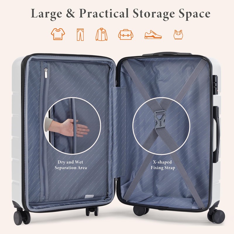 - 【Spacious Storage Space】With spacious and practical storage, wet and dry mesh areas, X securing straps and expandable storage capacity, this suitcases with wheels offers optimal organization and versatility, designed to meet all your travel needs. The premium zipper closure system gives you peace of mind and convenience when traveling.