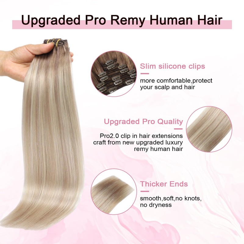 Sweetmet Pro2.0 Clip in Hair Extensions Real Human Hair 22inch 7pcs #8/60/18 Ash Brown to Ash Blonde Mix Platinum Real Hair Extensions Clip in Human Hair 120g(#8/60/18-22inch)