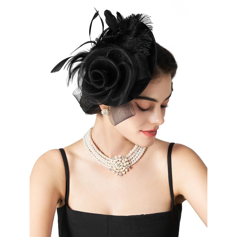 SWEETV Flower Sinamay Tea Party Fascinators for Women, Kentucky Derby Hats for Church, Cocktail, Wedding, Fancy Dress Party, Black