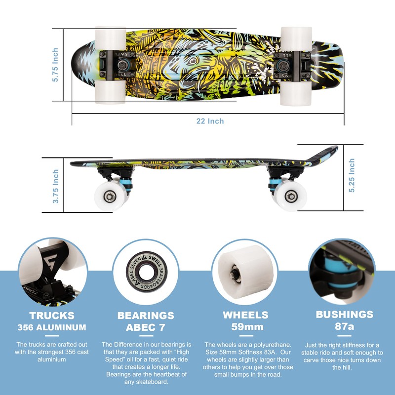 Swell Skateboards for Kids Ages 6-12 | Cruiser Complete Skateboard for Beginners, Boys, Girls, Youths, Teens, Adults College Students | 22 inch and 28 Inch Plastic Retro Mini Skateboard (22" Dorado)