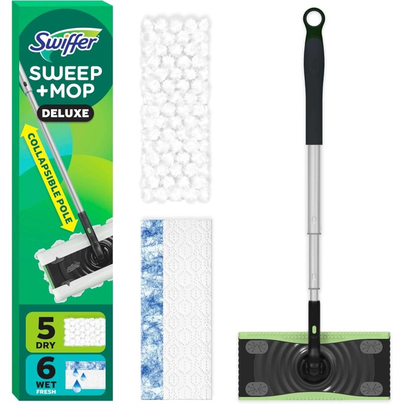 - The Swiffer Sweep and Mop Deluxe is a 2-in-1 Floor cleaning tool for sweeping and mopping. Features a collapsible pole for easy storage and reinforced pole for tough scrubbing. The locking head allows for easy cleaning of baseboards and tight spaces.