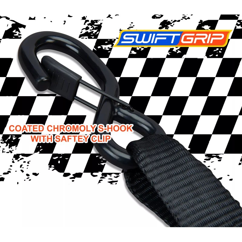 - Our Swift Grip Promise - you will be receiving superior built quality ratcheting straps, steel ratchets, anti-scratch rubber coated S-hooks and indestructible poly blend webbing with a warranty to back the quality of the product.