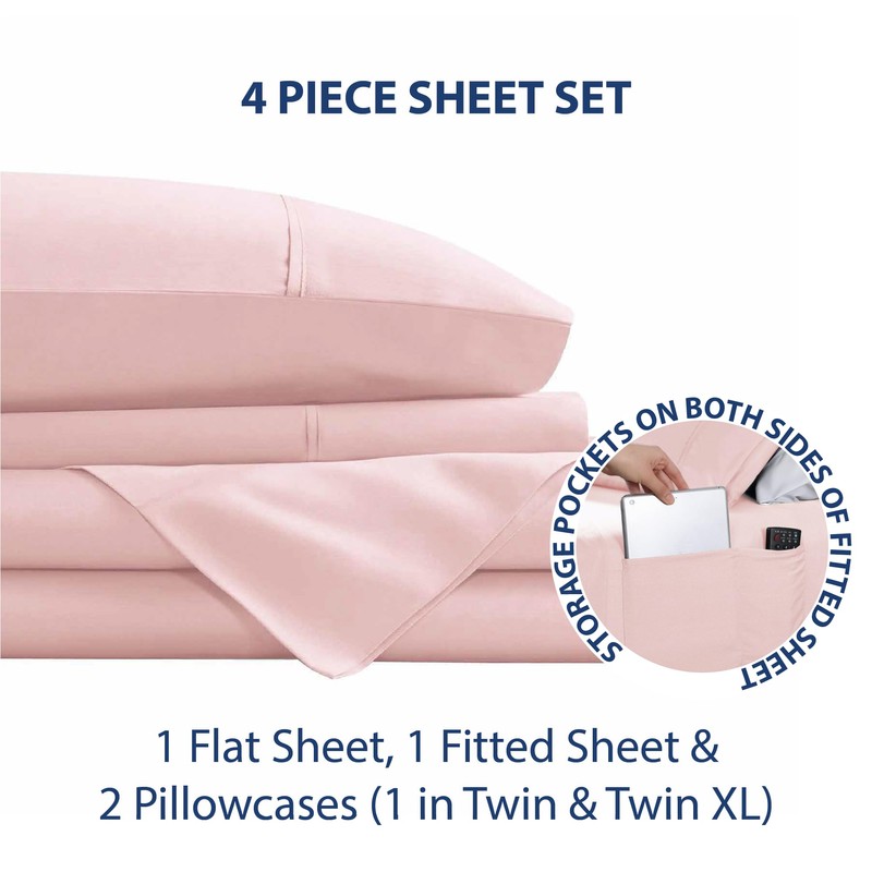 Swift Home Smart Sheets, Ultra Soft Brushed Microfiber 3-Piece Sheet Set, Fitted Bed Sheet with Side Storage Pockets – Blush, Twin XL
