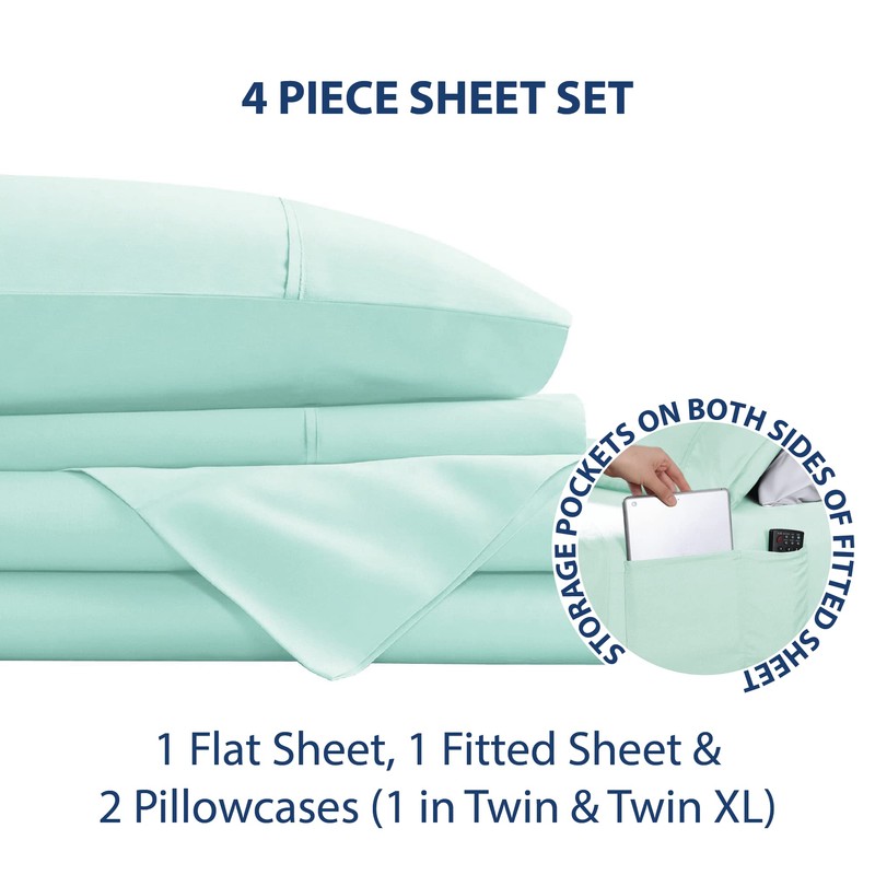 Swift Home Smart Sheets, Ultra Soft Brushed Microfiber 3-Piece Sheet Set, Fitted Bed Sheet with Side Storage Pockets – Mint, Twin