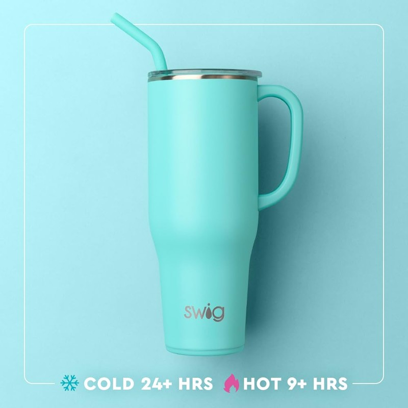- 40OZ TUMBLER WITH HANDLE AND STRAW keeps cold drinks cold for 24 hours and hot drinks hot for 9 hours with Swig Life's triple insulated, copper-plated, stainless steel cups. Large travel mug holds up to 40oz of your favorite beverages.