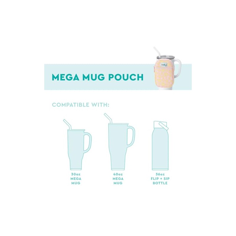 - MEGA MUG POUCH features an adjustable velcro non slip band, making it compatible with most handled tumblers, mugs, and water bottles 3.5-4" in diameter. Ideal for travel, hiking, or as your perfect gym phone holder.