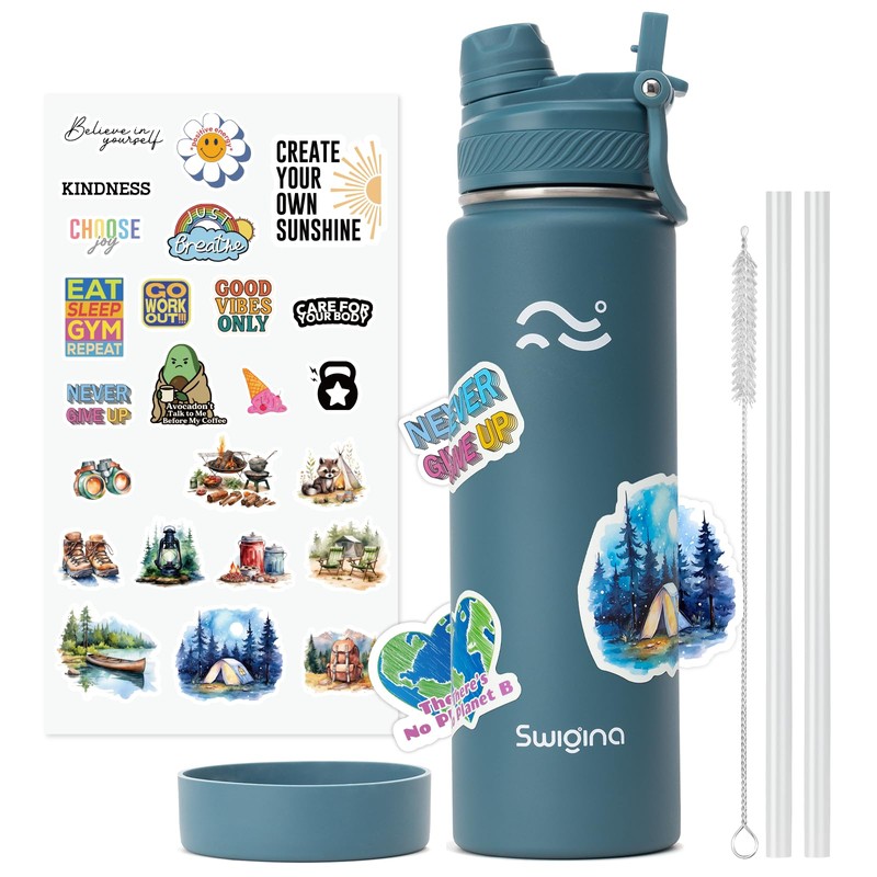 Swigina [2-IN-1 LID] Insulated Water Bottle with Silicone Boot (48hrs Cold/24hrs Hot) - DIY Stickers, Leakproof, BPA Free, 24 oz