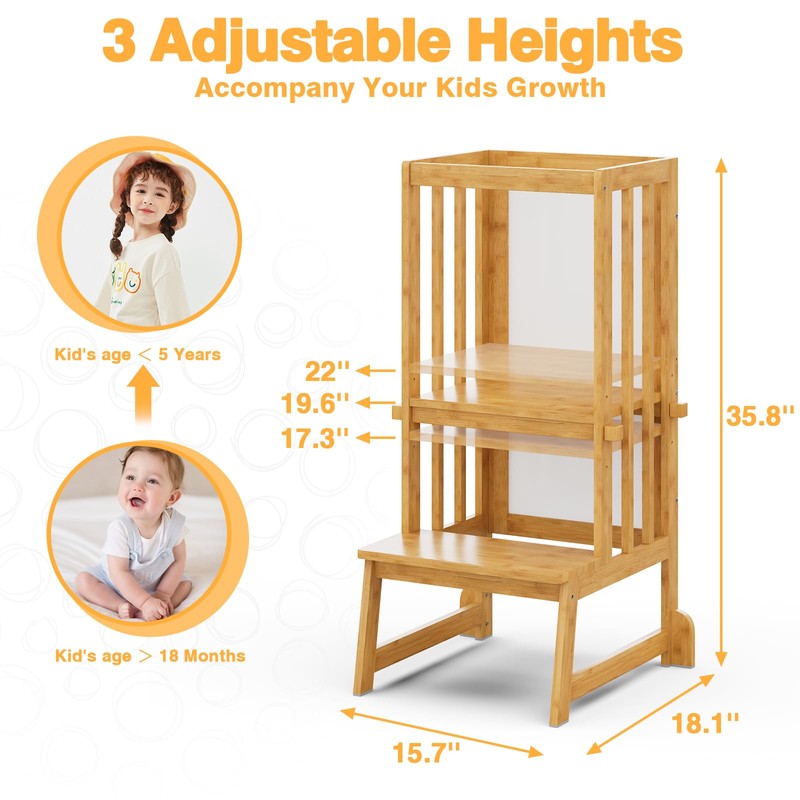 - Height Adjustable--Size of toddler stool for kitchen is 15.7(L)x18.1(W)x35.8(H), the adjustment plate can be adjusted from 17.3-19.6-22, suit for 18 months to 5 years old. Note: It must be used under 100% adult supervision