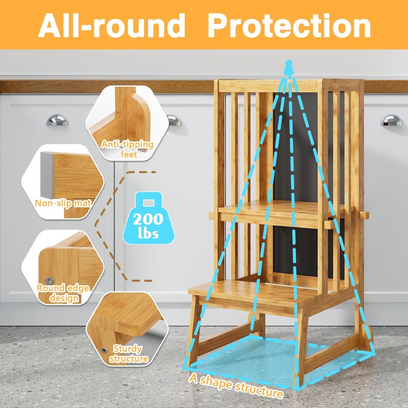 - All-round Protection--This toddler standing tower is A-type sturdy structure, anti-tipping feet with non-slip mat make ensure the toddler kitchen stool can stand steadily. All corners are round edge design, can bear max load of 200 lbs, allowing your kids to use it safely