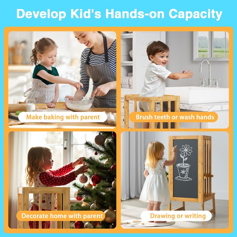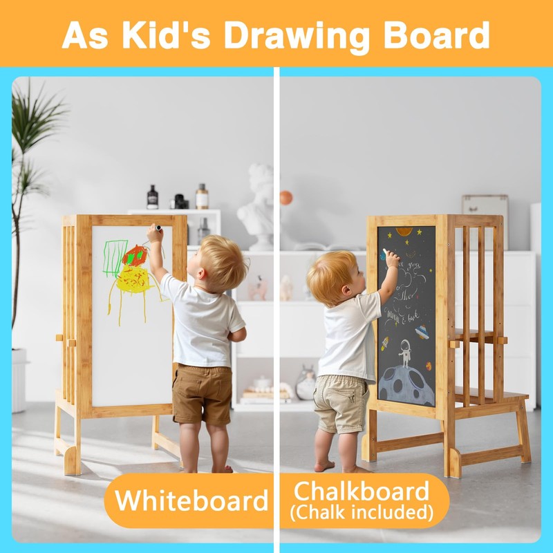 - 3-in-1 Function--The upgraded kitchen stool for toddlers with a blackboard & whiteboard for drawing or writing(chalk included). Our learning tower is designed to cultivate your kid's independence and hands-on ability