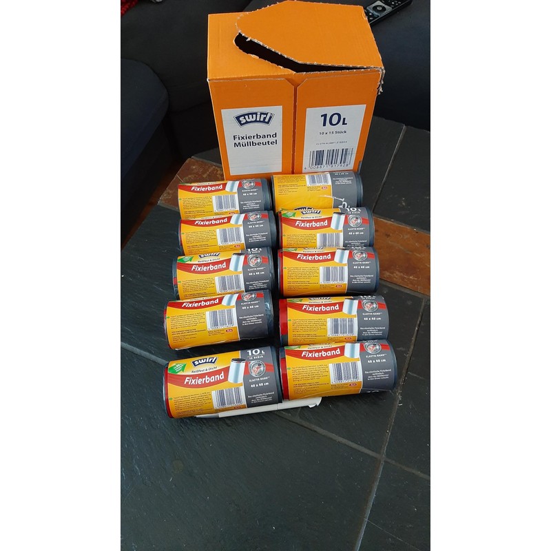 - Swirl Fixing tape bin liners 10 litres. The elastic fixing tape surrounds the bucket edge tightly and prevents the bin liner from slipping into the bin. The fixing tape can be used in addition to sealing and carrying. With tear-resistant 3-layer film. With liquid-tight base. Made from 80% recycled plastic.