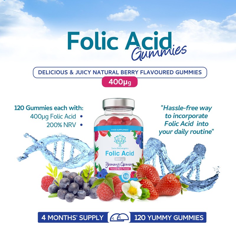 swiss bioenergetics Folic Acid Gummies - 400g, 120 Natural Berry Flavoured & Vegan Gummies - High Strength Vitamin B9 Folic Acid Pregnancy Support Prenatal Vitamin - No Artificial Sweeteners or Flavours C UK Made