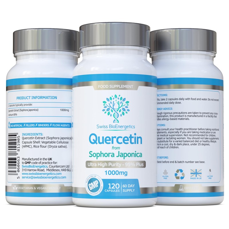 - PURE C Swiss BioEnergetics Quercetin capsules are manufactured using only the finest quality raw materials in their best natural grade and purest form so that we can guarantee you receive a consistently high-quality product. Swiss BioEnergetics utilizes the latest research to bring you premium, balanced, scientifically validated formulations free from: lactose, gluten, wheat, maize, soya, yeast, dairy, GMOs. Suitable for Vegetarians and Vegans
