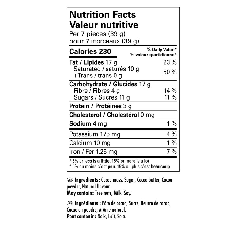 - DARK CHOCOLATE: 72% Dark Chocolate pieces.