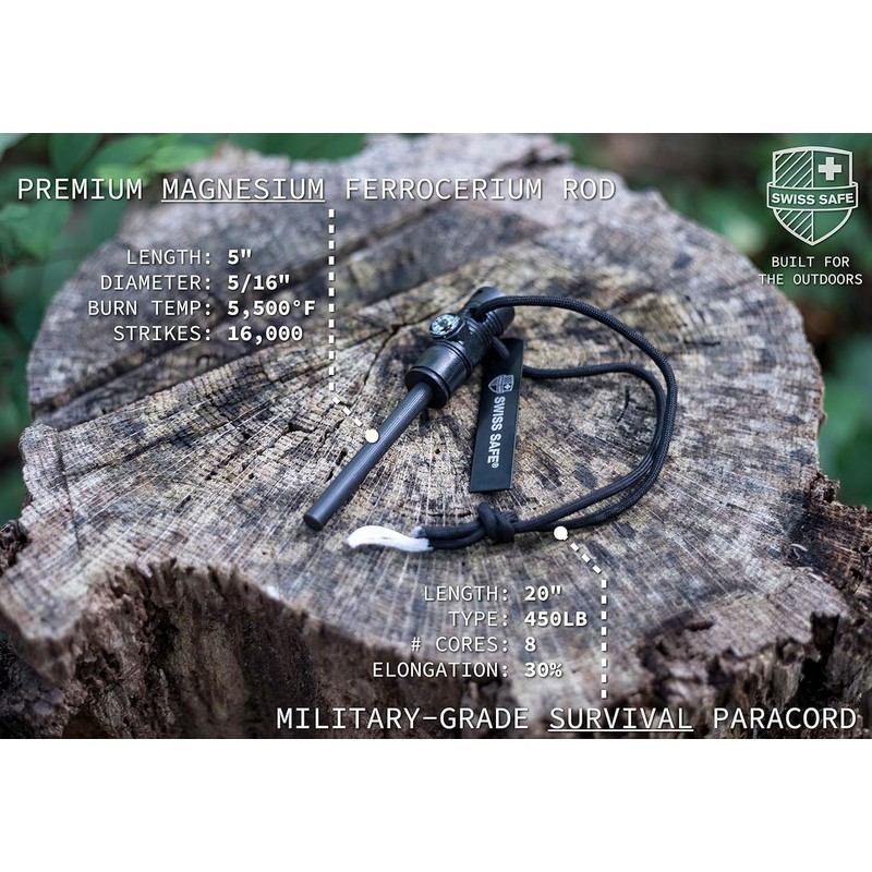 Swiss Safe 5-in-1 Magnesium Ferro Rod Fire Starter Survival Tool - Flint & Steel Striker, Compass, Paracord & Whistle - Emergency Kit for Backpacking, Camping, Hiking - All-Weather - Black, 1-Pack