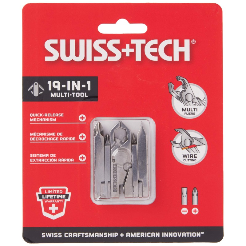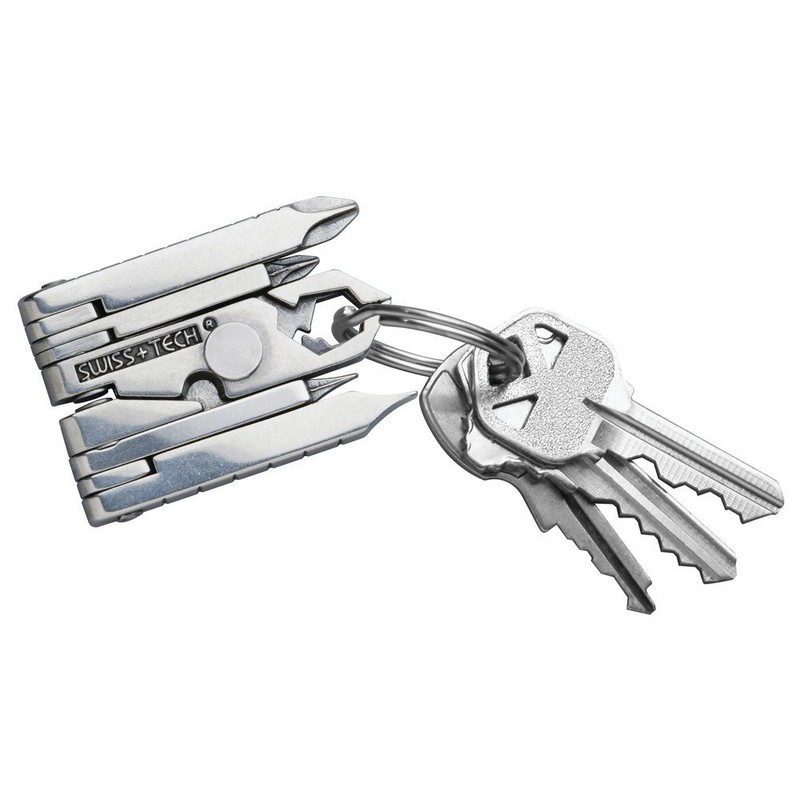 Amazon.comSwiss+Tech represents a quantum leap in the art of micro-tool making. They're compact, easily transportable tools that combine craftsmanship and innovation to create a new category of patented consumer products--Key Ring Tools. 19 tools in a single, portable keyring toolUnlike all other multi-function tools, many Swiss+Tech tools have a patented, quick-release, integrated locking system that attaches to any key ring, thereby eliminating the need for an additional ring or belt holster. These innovative, high-quality, light-weight products fulfill a common need--having the tools you need when you need them. They make a great gift.The Micro-Max 19-in-1 Series offers Swiss+Tech's most comprehensive and versatile set of tools to date. This solid stainless steel tool set, with its patented, quick-release and self-locking mechanism, folds out into 19 different professional-grade tools. Everyday tools for everyday convenience. Tighten, loosen, wire, drill, file, open and measure with ease. Includes 2 hex wrenches, 6 screwdrivers, pliers, wire cutter, wire stripper, wire crimper, hand drill, file, bottle opener, 2 rulers (mm and inch), and 2 ruler extensions. Patent pending design provides 24/7 pocket-sized readiness. Use with your key ring, purse, glove box, and more. What's in the Box?Swiss+Tech Micro-Max 19-in-1 Tool with the following tools: 1/4 Inch Hex Wrench 7/16 Inch Hex Wrench #0 Flat Screwdriver #1 Flat Screwdriver #2 Flat Screwdriver #0 Phillips Screwdriver #1 Phillips Screwdriver #2 Phillips Screwdriver Pliers Wire Cutter Wire Stripper Wire Crimper Nail File Hand Drill Bottle Opener Inches Ruler Inches Ruler Extension mm Ruler mm Ruler ExtensionProduct DescriptionThe Swiss+Tech ST53100 19-in-1 Multitool Key is a compact and easily transportable tool with a patented quick-release and integrated locking system that attaches to any key ring. The multi keychain tool folds out into nineteen different professional-grade tools, giving you easy access to the tools you need when you need them. The 19-in-1 tool has everyday tools for everyday convenience. Tighten, loosen, wire, drill, file, open, and measure with ease. The Swiss-tech multi-tool includes two hex wrenches, three flathead screwdrivers, three Phillips head screwdrivers, pliers, a wire cutter, a wire stripper, a wire crimper, a nail file, a hand drill, a bottle opener, two rulers (one inch and one millimeter), and two ruler extensions (one inch and one millimeter). It's ideal for use while camping or hunting, for auto repair, for installing hardware, and much more. Made of solid stainless-steel construction with a polished finish.