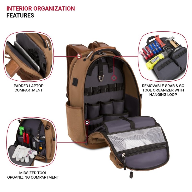 - Tech Backpack: The 19-inch laptop bag blends contemporary design with 60 innovative tool storage solutions to protect your tech and tools, keeping all your essentials neatly organized