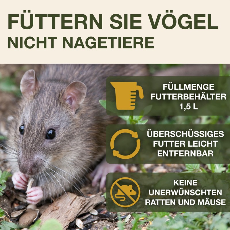 - Feed birds - not rodents. Newly designed catch tray prevents bird food from falling to the ground.
