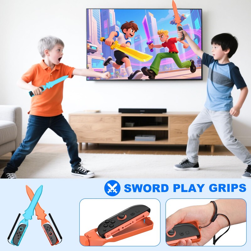 - Sword grips with precise SL/SR button access - Switch 2 accessories Specially designed for Swordplay in Switch Sport! Thanks to the widened grip zones (ergonomically shaped ABS plastic) and 3 mm non-slip grooves, the set allows precise movement control. Compatible with Switch 2 Joypad - The rounded edges and beveled button edges prevent pressure points during long duels