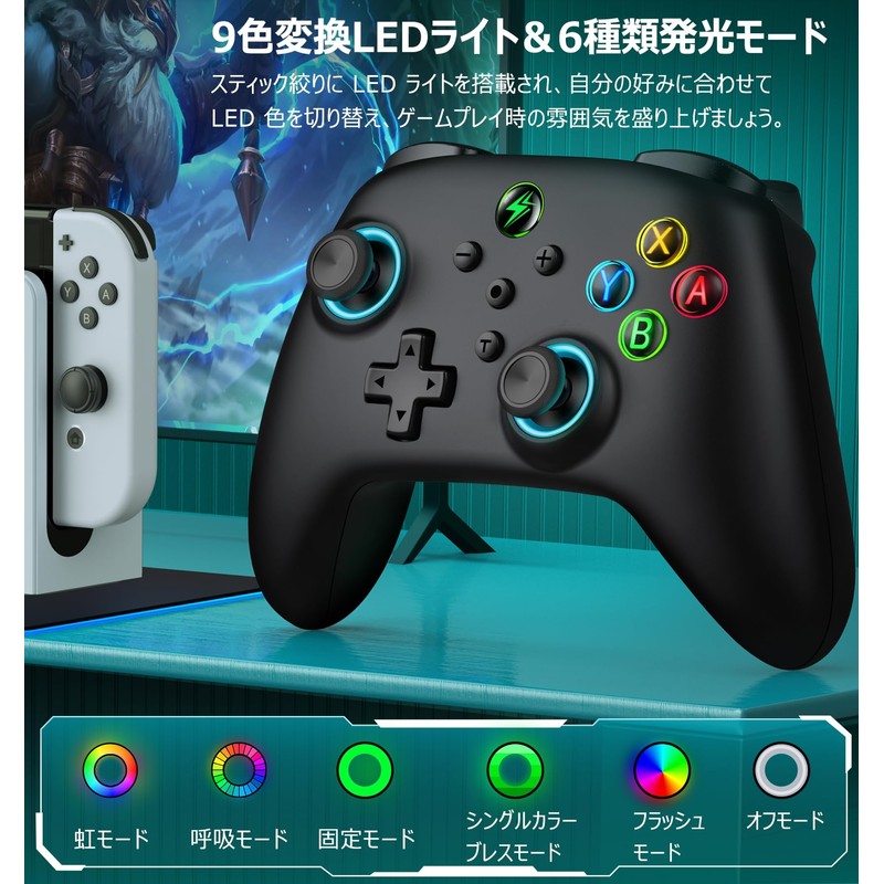 - đă8 Color Conversion LED Lights & 6 Lighting Modesă The Pro controller switch has 8 RGB lights and 6 lighting modes, and different color combinations to create new lighting colors. 6 modes can be freely selected, including rainbow mode/breathing mode/fixed mode/single color breathing mode/flash mode/off mode. This gives you a novel and versatile gaming experience