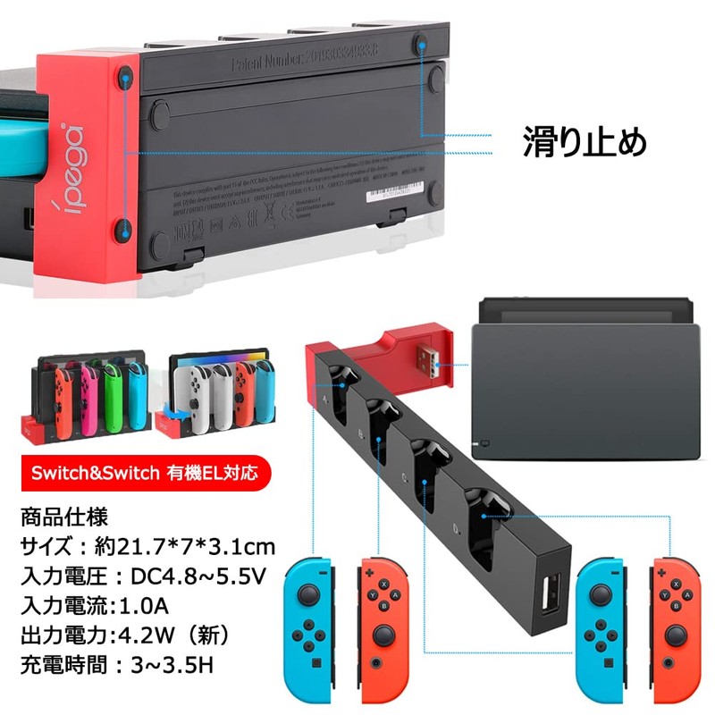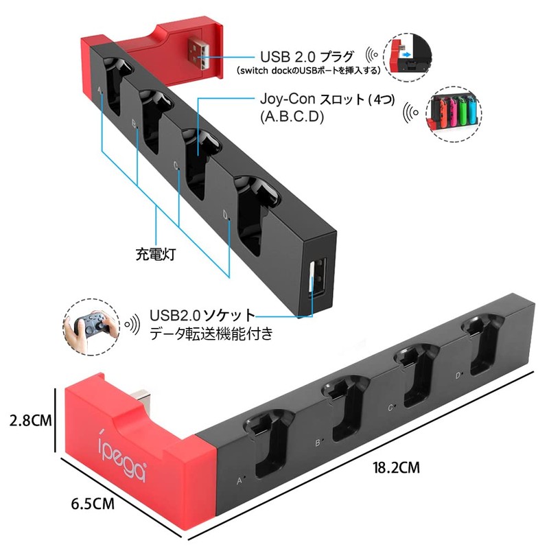 - Integrated Joycon Charging Stand & Rapid Charging: Equipped with a USB 2.0 male plug interface for rapid charging, 1.4 times faster than conventional chargers, and simultaneously charges 4 Joy-Con devices. The product is compact, simple and easy to operate, and it is integrated so it does not take up much space and can be stored and charged
