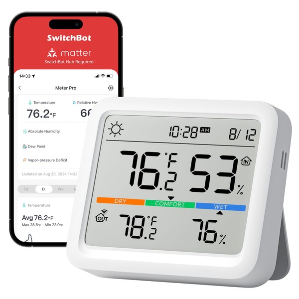 - Wireless 5-in-1 Meter Pro: The SwitchBot Meter Pro features a 3.6-inch large screen that displays temperature, humidity, time, date, comfort level, and weather forecasts (Hub required). This smart hygrometer and thermometer provides all essential information at a glance for a comfortable home environment.