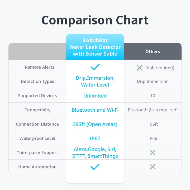 - Part of SwitchBot Ecosystem, Voice Command Compatible: Use with SwitchBot Plug Mini or Indoor Cam, and remotely turn off electrical equipment or check the condition of your house in case of leakage. It can also support third-party services such as Google, Siri, IFTTT, SmartThings.